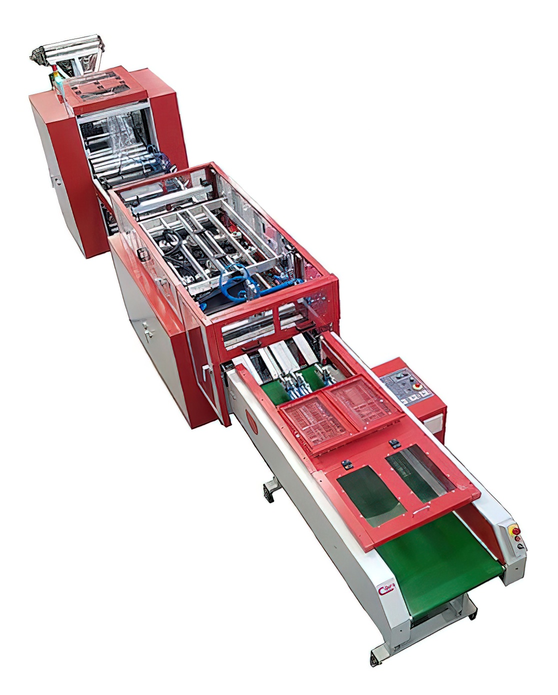 Le due buste prodotte contemporaneamente vengono espulse dalla testa saldante e vanno a posizionarsi sulla barra di raccolta, perfettamente impilate fino a raggiungere la quantità preimpostata per la mazzetta. Al raggiungimento del numero di battute prestabilito, la mazzetta viene estratta dalla barra di raccolta da delle pinze azionate ad aria compressa. Le pinze portano le mazzette sotto il punzonatore a caldo (se inserito) e successivamente sul nastro trasportatore di uscita, mentre la testata saldante continua a lavorare preparando le mazzette successive. Le pinze poi tornano in posizione per prendere le mazzette successive. Un operatore provvederà a prelevare le mazzette dal nastro di asporto.